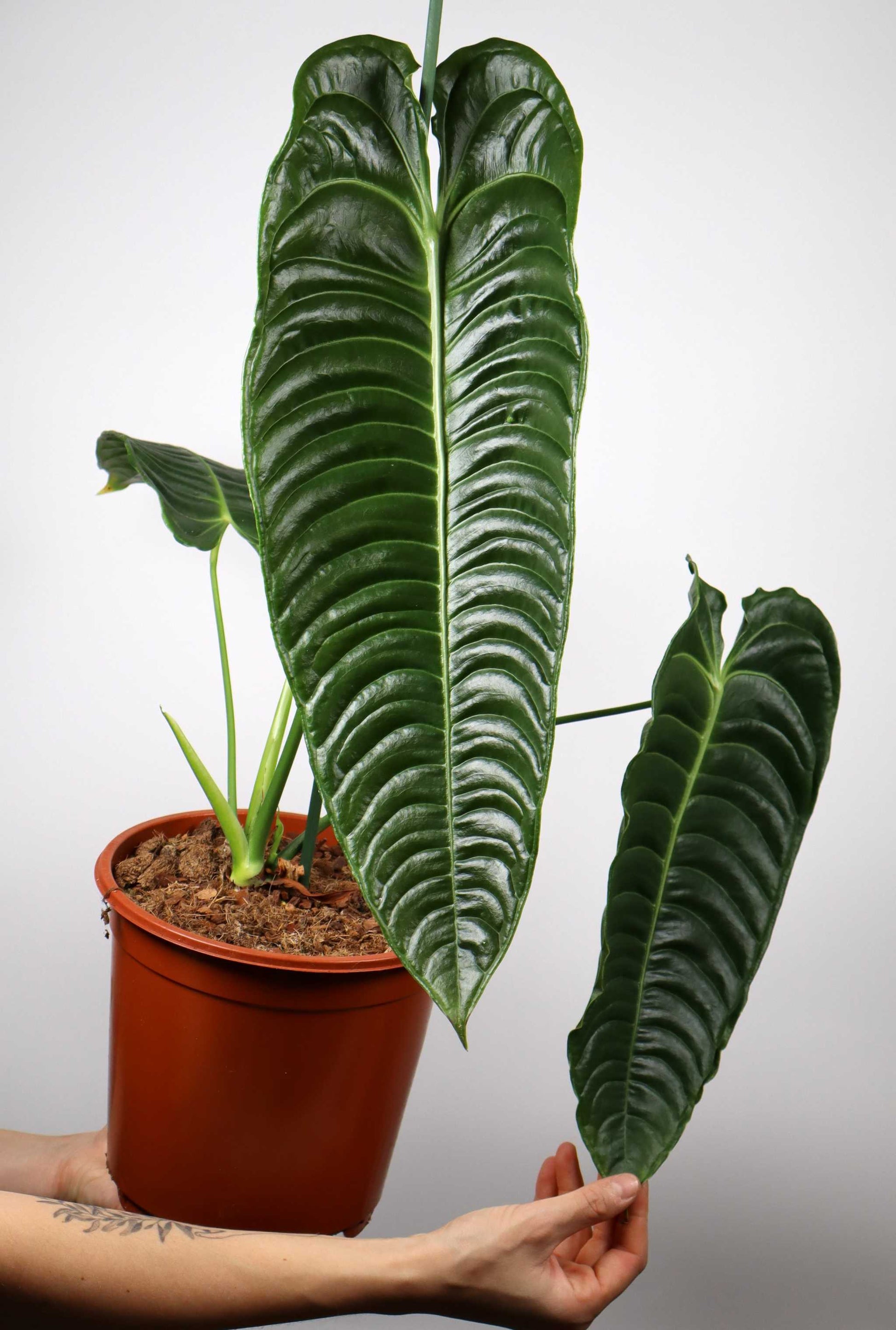 Pflege: Pflanzen Sie Ihren Anthurium Veitchi in eine luftige und gut durchlässige Bodenmischung, die seinem natürlichen Lebensraum nachempfunden ist, wie zum Beispiel unsere Aroid-Erde , eine Mischung aus Orchideenrinde, Sphagnum und Perlit. Diese Pflanze gedeiht am besten bei hellem, aber indirektem Licht und benötigt für eine optimale Entwicklung eine hohe Luftfeuchtigkeit. Gießen Sie regelmäßig, aber achten Sie darauf, dass die Erde zwischen den Wassergaben leicht austrocknet, um Wurzelproblemen vorzubeugen.