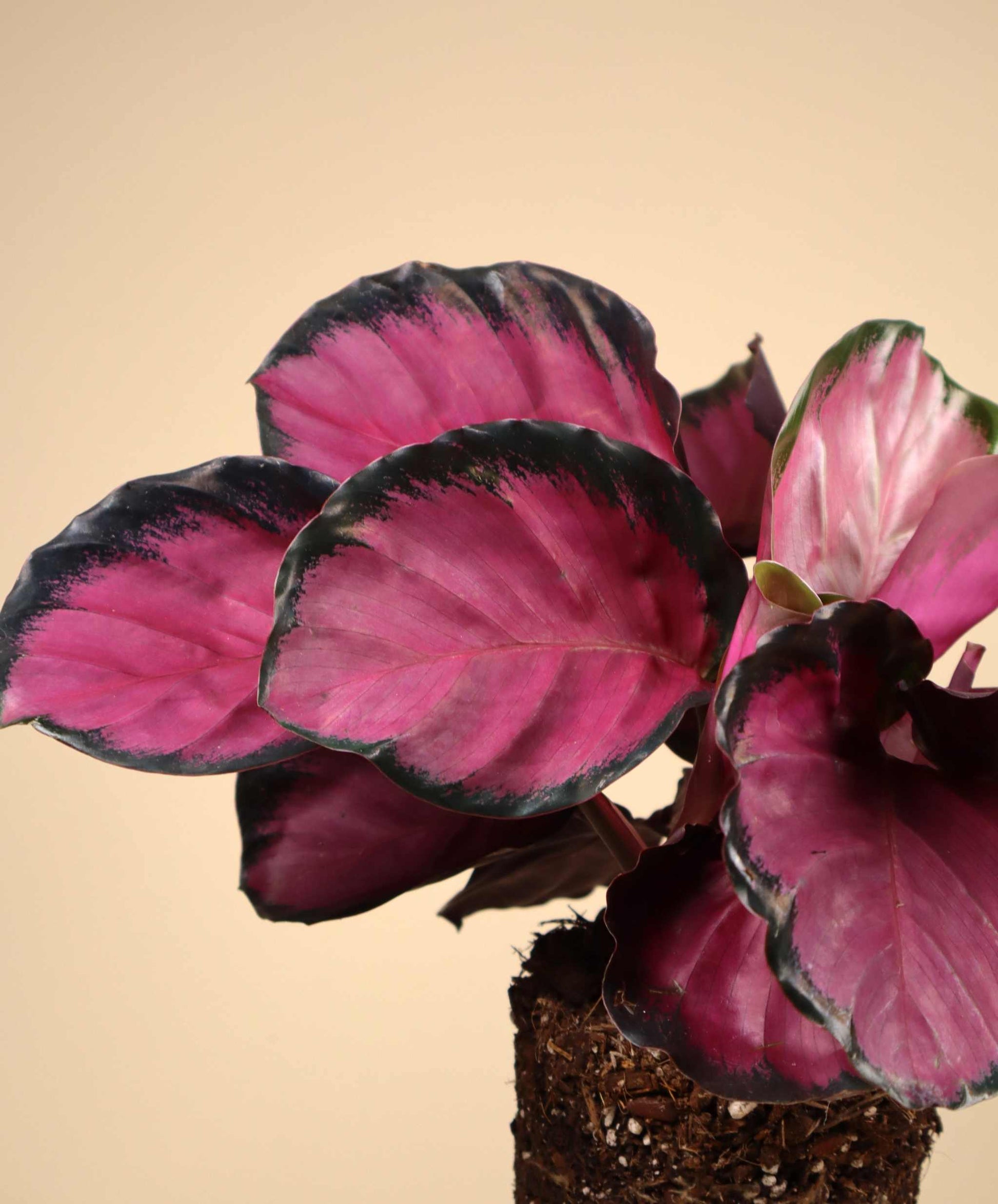 Calathea roseopicta „Dottie“ ist eine farbenfrohe und lebhafte Zierpflanze, die für ihre tiefvioletten Blätter und subtilen Muster bekannt ist. Sie gedeiht in Innenräumen und ist gut an normale Raumtemperaturen und Lichtverhältnisse angepasst.