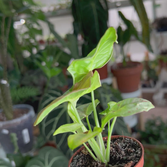 Pflege: Für beste Ergebnisse empfehlen wir , Syngonium 'Milk Confetti' in unsere Aroid-Erde zu pflanzen. Stellen Sie die Pflanze in indirektes Licht. Lassen Sie die Erde zwischen den Wassergaben leicht antrocknen.