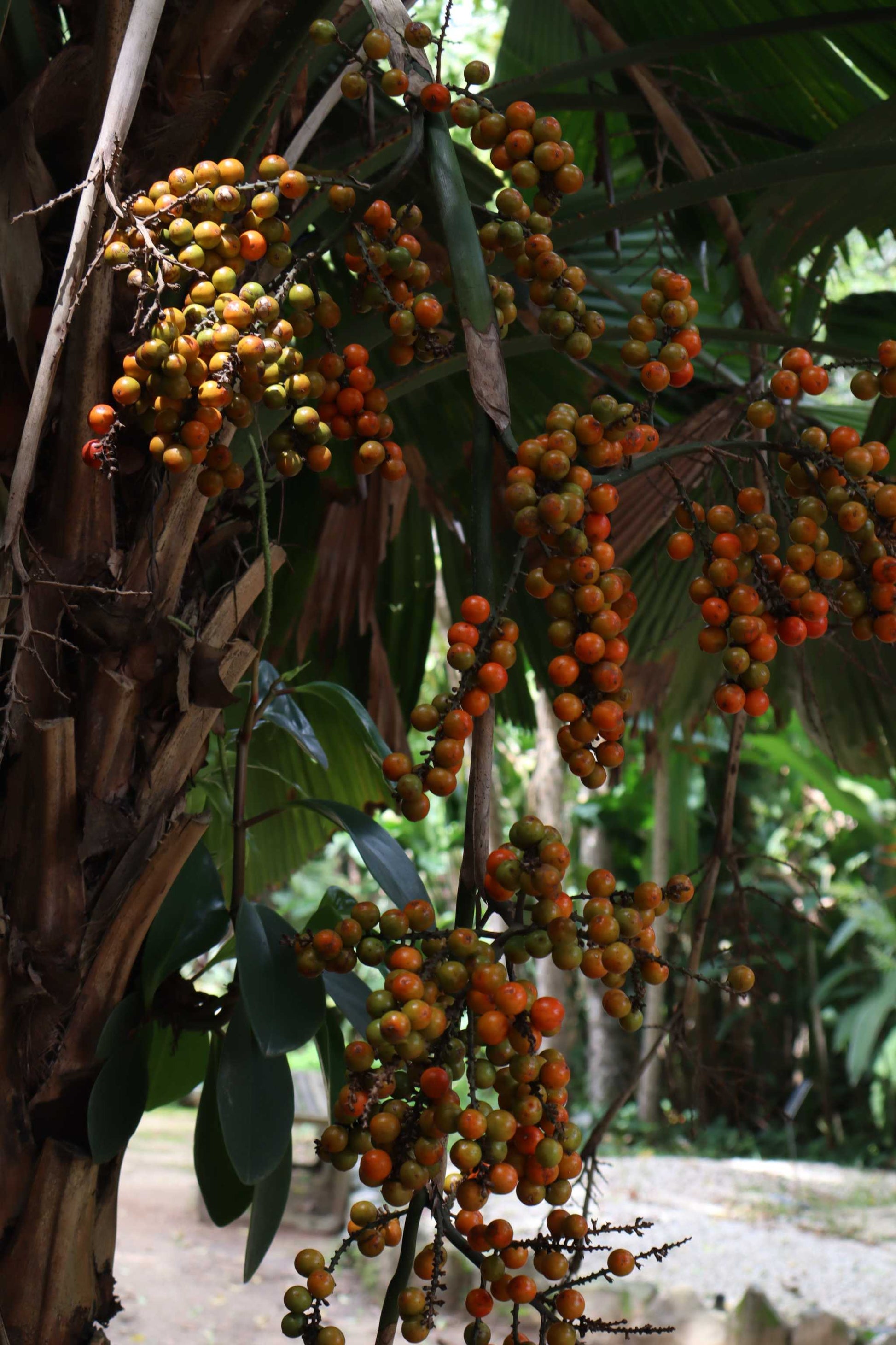 This impressive palm grows up to 3 meters tall with a slender trunk 5-6 centimeters in diameter, crowned by a magnificent crown of leaves.