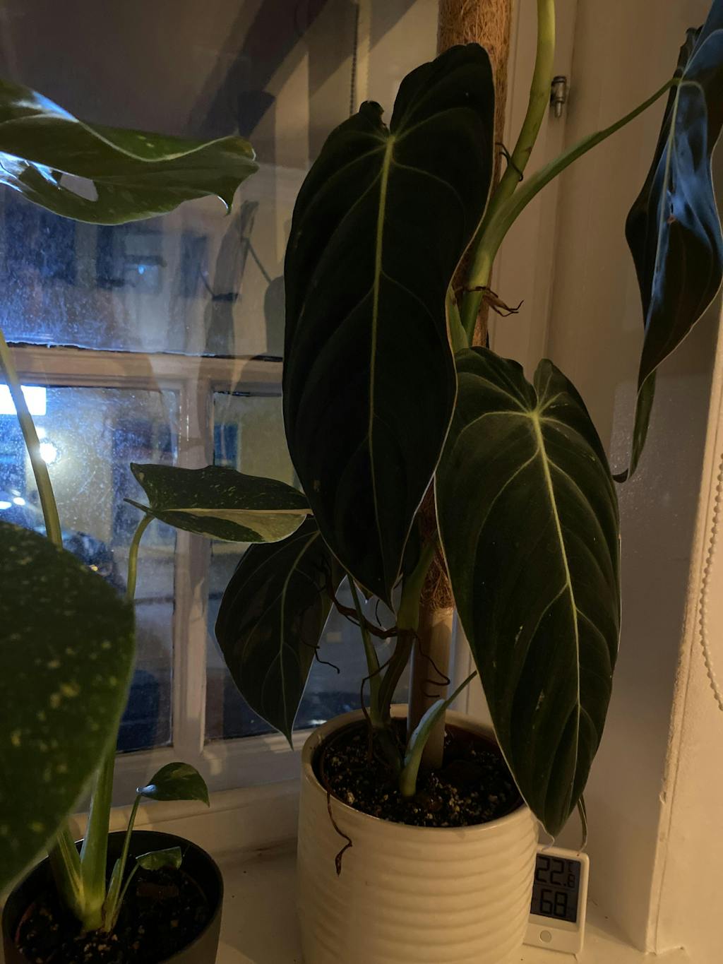 Bladen på Philodendron melanochrysum har en rosa färg innan de mörknar till nästan svart med åldern. De gröna bladen växer i storlek ju högre plantan blir! Som en klätterväxt trivs Philodendron melanochrysum bäst när den har något att klättra på. En mosspåle rekommenderas starkt, vilket ger växten en möjlighet att få stora gröna blad.