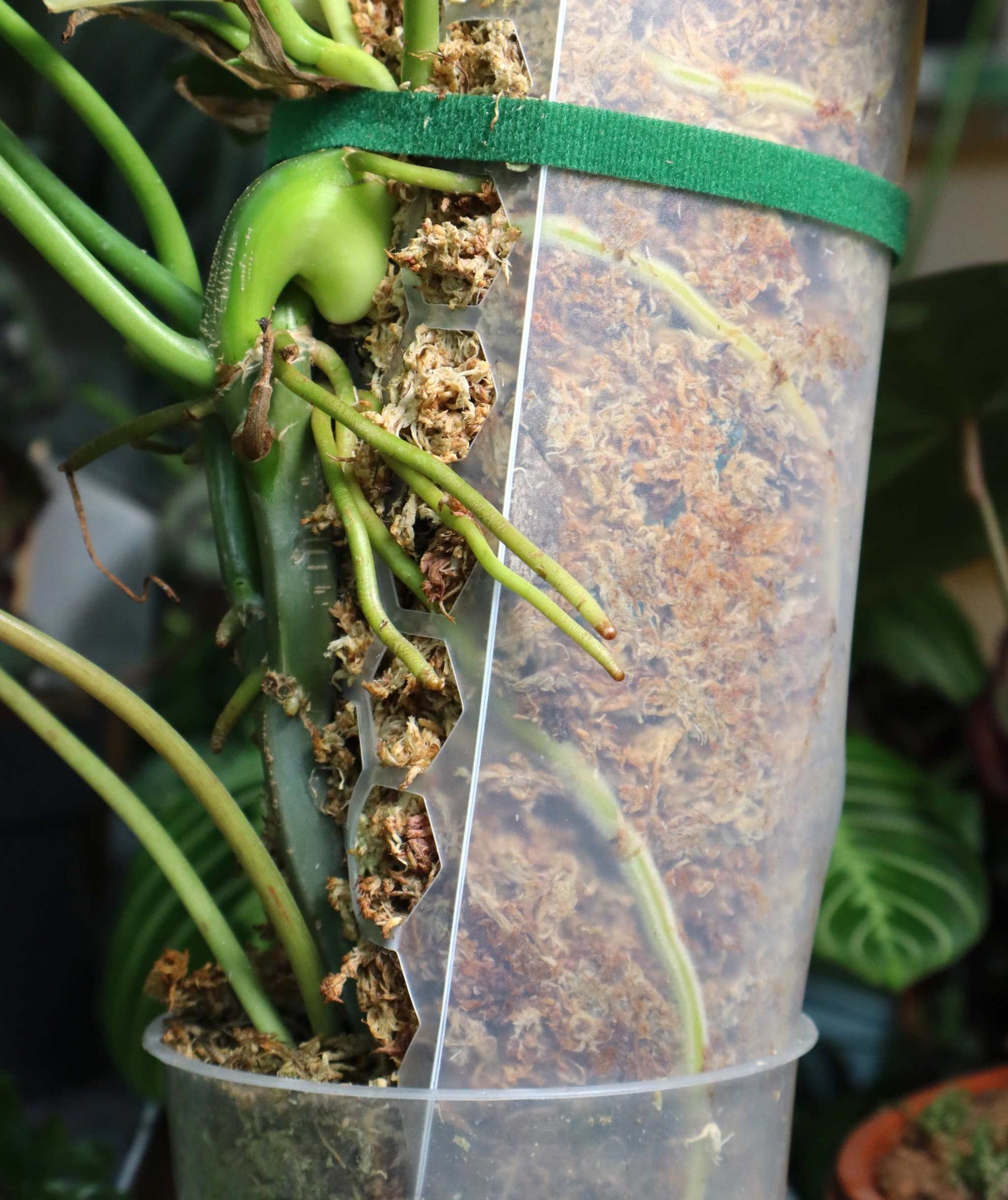 Mosspålen är enkel att montera. Fyll med mossa eller substratblandning, stäng pålen i önskad diameter och placera i krukan.