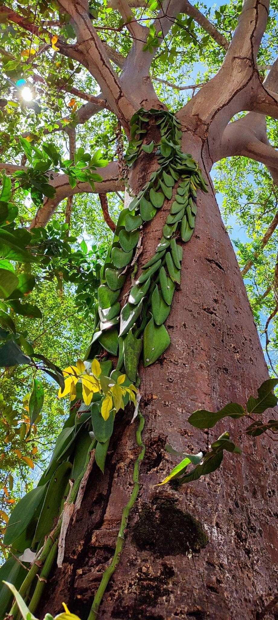 Denna sällsynta epifytiska (växer på andra växter) orkidé klättrar upp längs träd och andra växter med hjälp av sina köttiga luftrötter utan att skada värdväxten. Det gör den särskilt lämpad att odla på en mosspåle, vilket vi starkt rekommenderar.